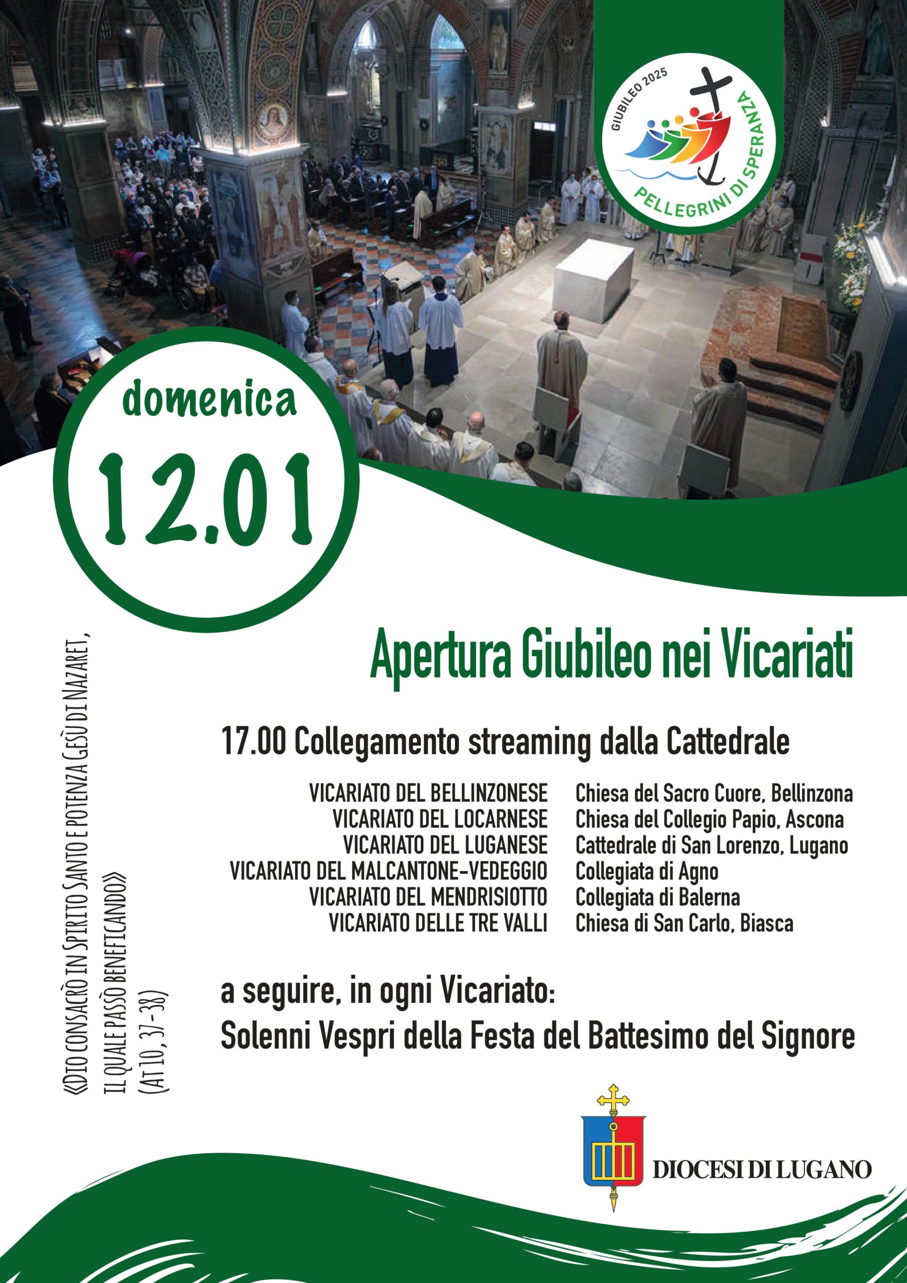 Dopo la solenne cerimonia di domenica 29 dicembre 2024, durante la quale è stato ufficialmente aperto il Giubileo ordinario in Diocesi, è ora il momento dei Vicariati. Domenica 12 gennaio 2025, alle ore 17 dalla Cattedrale di San Lorenzo in Lugano, l’Amministratore apostolico della Diocesi di Lugano mons. Alain de Raemy si collegherà in diretta streaming per un messaggio a tutte le Parrocchie. Terminata la diretta, ogni Comunità riunita in una delle 6 chiese preposte, reciterà la preghiera dei Vespri della Festa del Battesimo del Signore. Il Messaggio del Vescovo Alain potrà essere seguitò sul canale YouTube della Diocesi di Lugano. Subito sotto, la locandina ufficiale con tutte le indicazioni.