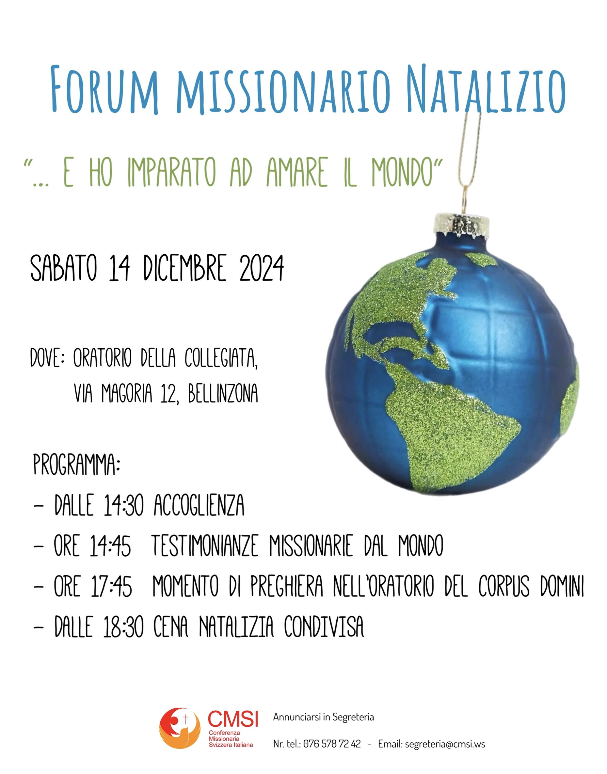 Il 14 dicembre dalle 14.30, all’Oratorio di Bellinzona (dietro la chiesa collegiata) avrà luogo il Forum Missionario della Conferenza Missionaria, con testimonianze online di diversi missionari. A seguire cena natalizia condivisa. Iscrizioni: segreteria@cmsi.ws, 076 578 72 42.