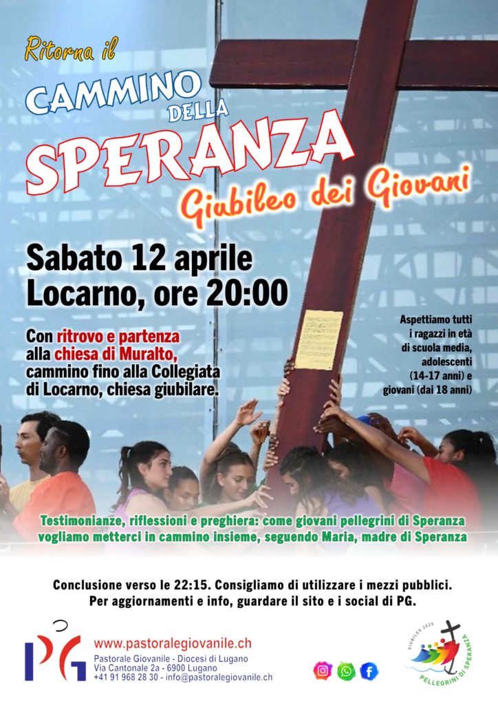 Sabato 12 aprile 2025, a Locarno, si terrà il Cammino della Speranza, occasione di festeggiare assieme anche il Giubileo dei Giovani diocesano, pensato per i ragazzi dalla terza/quarta media, i giovanissimi e giovani. Un momento semplice ma intenso, che unisce cammino, ascolto e fede. Per chi lo desidera il ritrovo è alle 19.00 per una cena al sacco assieme, poi alle 20.00 la partenza da Muralto.