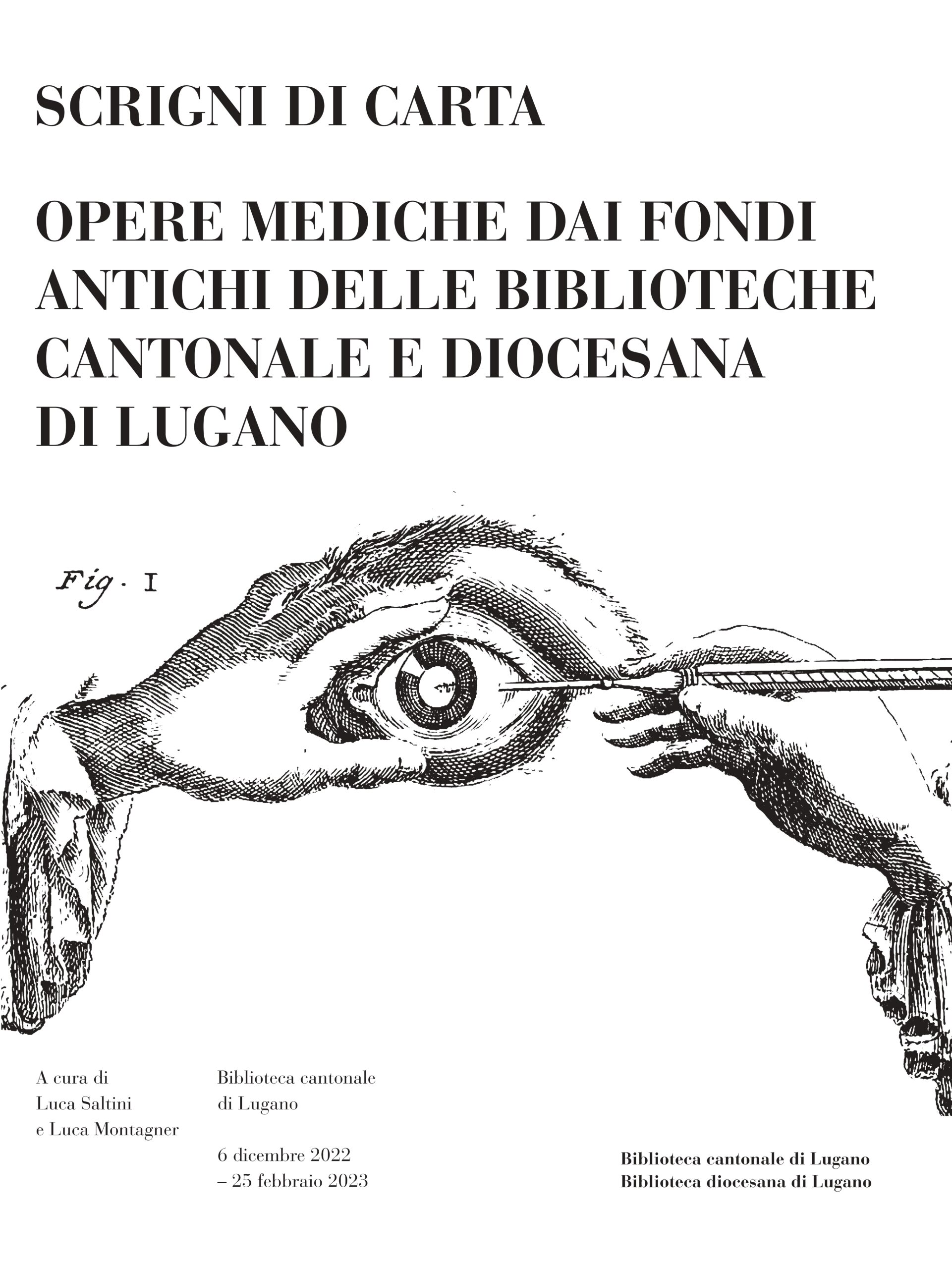 Al momento della sua nascita, la Biblioteca cantonale di Lugano disponeva di un patrimonio librario proveniente quasi tutto dalle collezioni di alcuni conventi soppressi dallo Stato. Queste raccolte costituiscono oggi il nucleo preponderante del fondo antico dell’istituto. Vista la loro origine, numerose opere sono legate all’attività degli ordini religiosi, ma, ad uno sguardo più attento, gli interessi dei frati si rivelano molto più aperti di quanto un facile pregiudizio lascerebbe immaginare. Tale considerazione è ancora più opportuna riguardo alla Biblioteca diocesana che, costituita in origine per i seminaristi, si è arricchita nel tempo di numerose opere, spingendosi con le sue collezioni ben al di là di temi di carattere teologico-religioso. Sulle basi di queste considerazioni, è stata realizzata dai due istituti questa mostra – dal titolo Scrigni di carta. Opere mediche dai fondi antichi delle biblioteche cantonale e diocesana di Lugano – che segue un percorso meno prevedibile, quello della medicina, e racconta l’evoluzione della disciplina tra il ‘500 e il ‘700. Sono numerosi infatti i volumi dei fondi antichi legati all’argomento, dalle raccolte enciclopediche, alle opere illustrate di anatomia e chirurgia, ai testi sulle malattie, alla farmacopea, agli studi dei medici più famosi del passato.