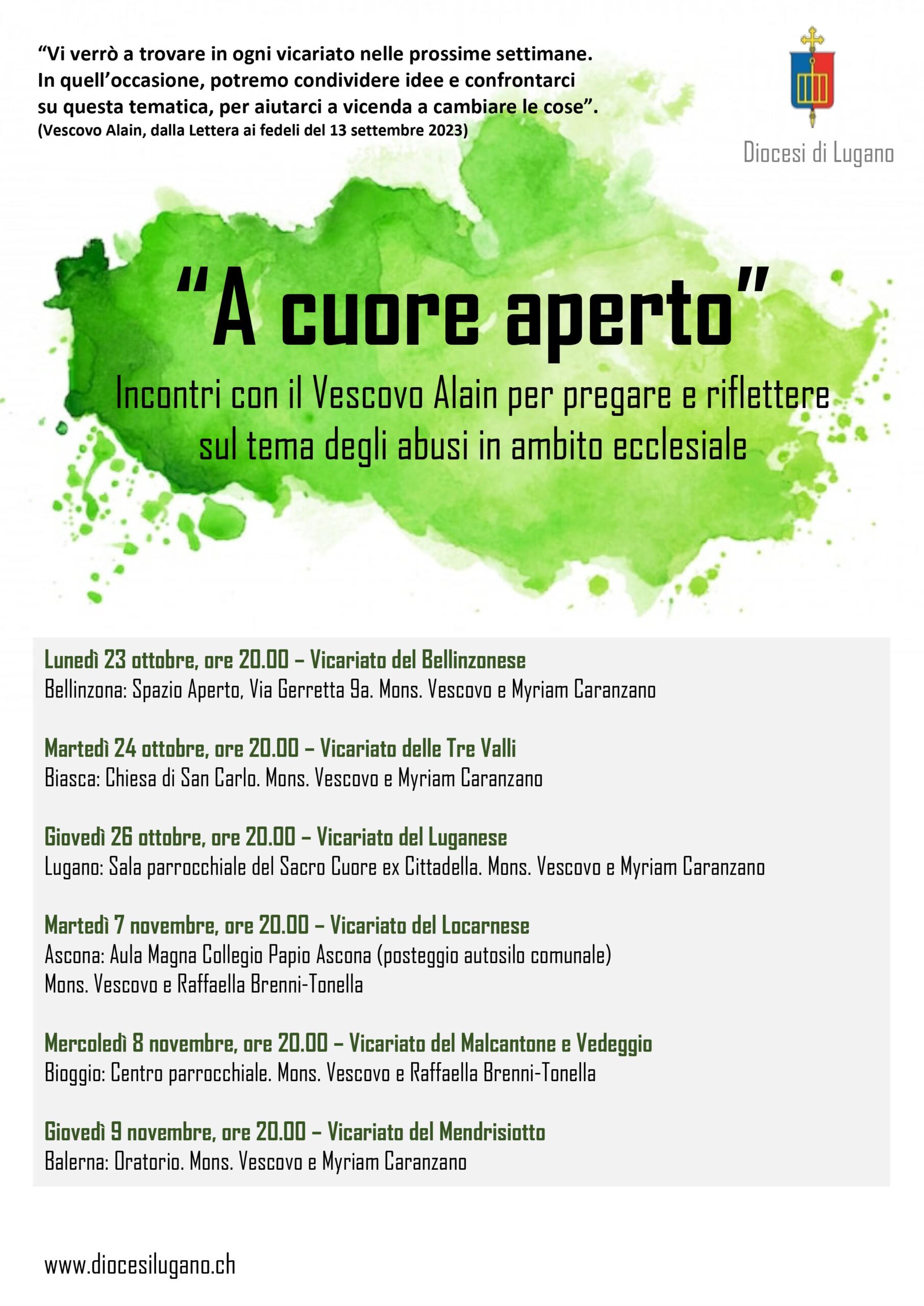 Con queste parole l’Amministratore apostolico della Diocesi, mons. Alain de Raemy, annunciava al termine della conferenza stampa diocesana del 13 settembre u.s. la promessa di recarsi in tutti e sei i Vicariati della Diocesi per incontrare e ascoltare i fedeli a seguito dei risultati emersi dal rapporto finale del progetto pilota sugli abusi sessuali nella Chiesa in Svizzera dagli anni ’50, pubblicato il 12 settembre 2023 dall’Università di Zurigo. Questa promessa è stata mantenuta e sono quindi state organizzate le visite, che si terranno l’ultima settimana di ottobre e la seconda di novembre.