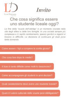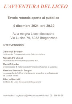 Lunedì 9 dicembre alle 20.30, nell’aula magna del Liceo diocesano di Lucino (Via Lucino 79, Breganzona), si terrà una tavola rotonda aperta a tutte le persone che vogliano approfondire il senso e il valore degli studi liceali nella società di oggi, con tutte le sue nuove potenzialità e i suoi fattori di crisi.