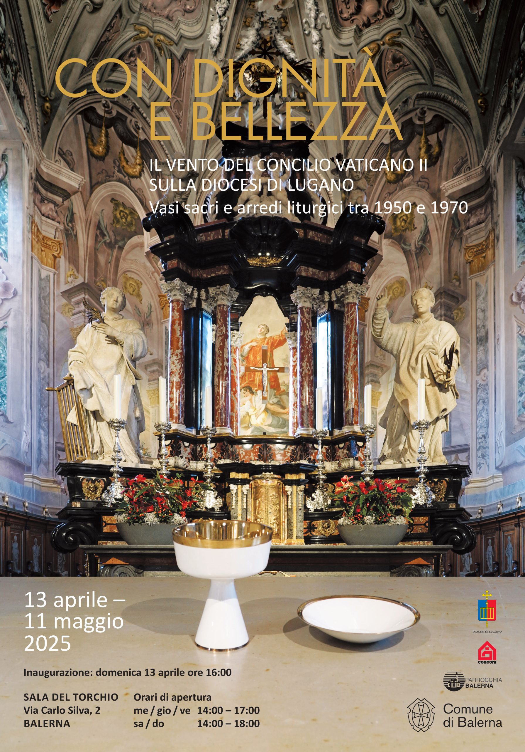 Il Concilio Vaticano II (1962-1965) ha segnato profondamente la vita della Chiesa cattolica al suo interno ma anche nel suo rapporto con il mondo che stava per vivere i grandi sconvolgimenti del Sessantotto. L’inedita mostra indaga il periodo attorno al Concilio sotto l’angolazione del rinnovamento dell’arte liturgica sul territorio ticinese. Nella scia del convegno “Nobile semplicità. A 60 anni dalla Sacrosanctum Concilium” tenuto a Lugano nel settembre 2023, l’esposizione viene a rendere ulteriore ragione di un periodo fecondo e per certi versi irripetibile che ha visto una piccola diocesi attivamente coinvolta nel processo di riforma liturgica culminato nel Concilio e capace di offrire alla Chiesa universale un contributo originale che precorreva i tempi. Proprio nella nostra umile “terra di mezzo” si sono create in anticipo le condizioni per l’incontro e lo scambio tra le correnti teologiche-bibliche-liturgiche più aperte del nord e quelle più moderate e conservatrici della Chiesa romana: un segno importante fu il Terzo Convegno internazionale di studi liturgici tenuto proprio a Lugano il 14-18 settembre 1953, che affrontò il tema della partecipazione attiva dei fedeli alla Liturgia e l’uso della lingua del popolo al posto del latino e pose anche le basi per la riforma della Settimana Santa. Si volle che il Convegno iniziasse proprio con un’esposizione di arredi e paramenti liturgici innovativi tenuta nel Seminario di Lugano. Un avvenimento così importante come il Concilio non poteva non lasciare un’impronta di nobile e semplice bellezza anche nella progettazione di nuove chiese, nel rinnovo di arredi e spazi liturgici e dei vasi sacri utilizzati nella Liturgia. Proprio a questi ultimi è dedicata l’esposizione di Balerna.